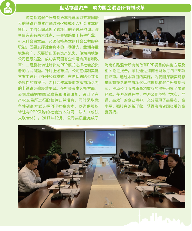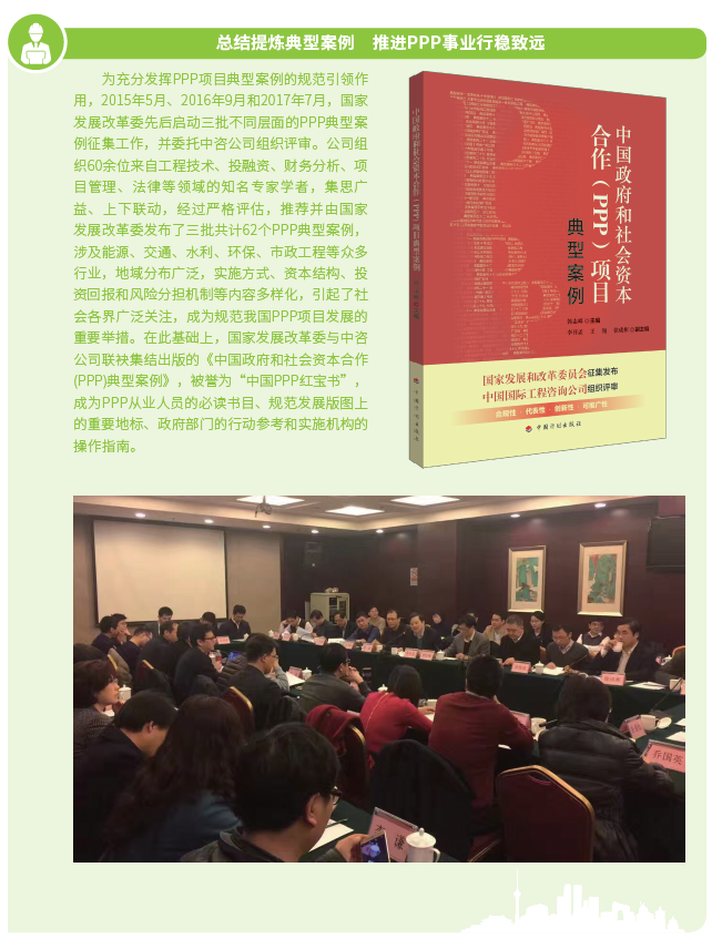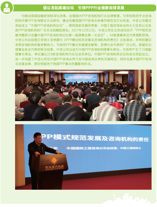 2016年以来,中咨公司紧紧围绕“12445”发展战略构想,巩固提升五大业务支撑体系,积极探索开展政府和社会资本合作(以下简称PPP)咨询等投资策划业务,建立投融资平台,寻找有价值的投资机会,实现资本与智本的融合,构建智力服务新业态,拓宽工程咨询服务价值链。