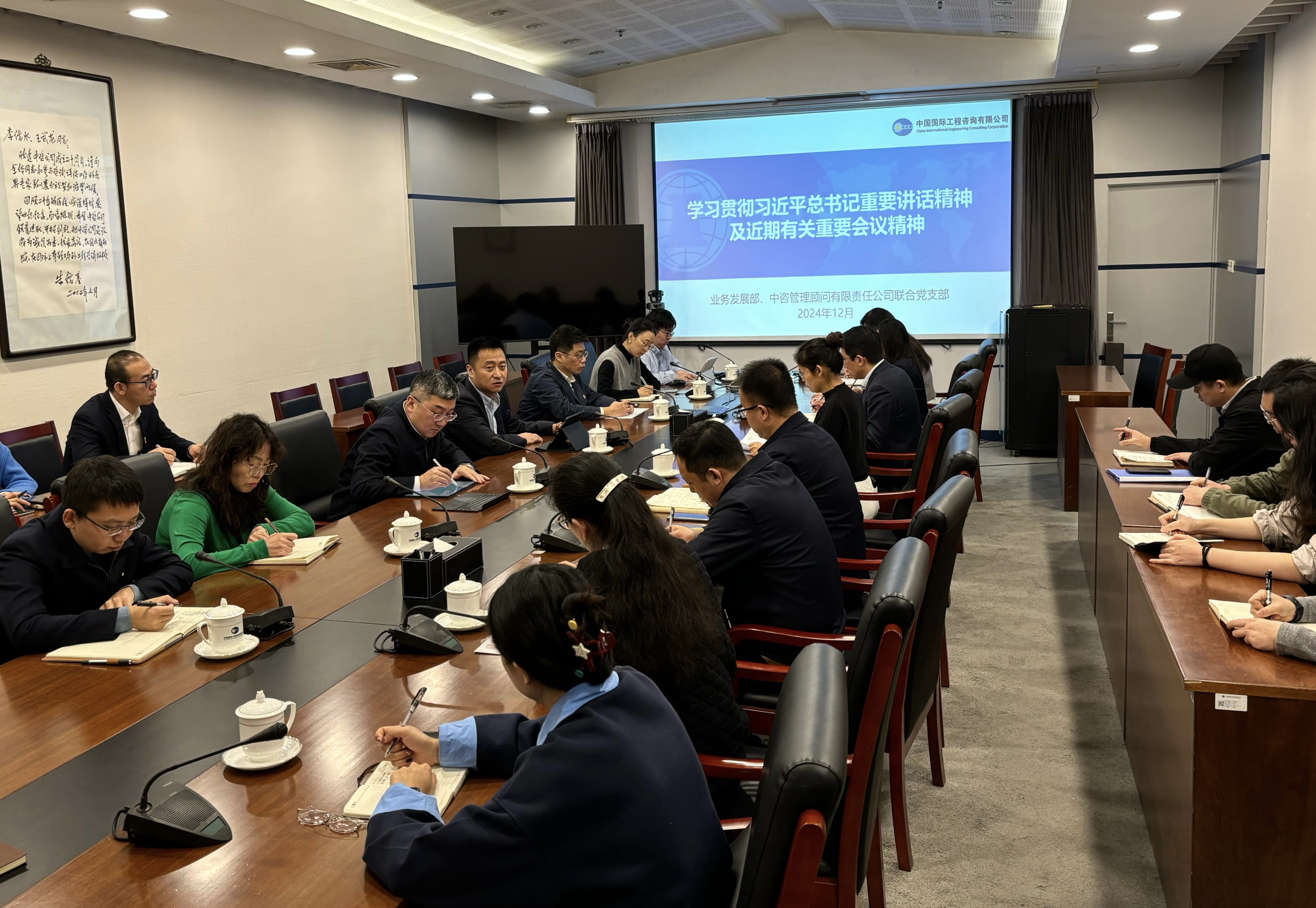 深学细悟明方向,实干笃行谱新篇。连日以来,中咨公司各级党组织认真学习领会习近平总书记在中央经济工作会议上的重要讲话精神,贯彻落实全国发展和改革工作会议、全国能源工作会议精神,坚定发展信心、保持奋斗恒心,把准政策导向、找准主攻方向,在服务国家重大战略、规划、工程、项目上靶向发力,以公司高质量发展的实干实绩助推国家经济社会高质量发展。 公司各级党组织组织传达学习 集团公司党委:第一时间传达 第一时间部署 12月16日,中咨公司召开党委会议,及时传达学习中央经济工作会议、全国发展和改革工作会议、全国能源工作会议精神,研究贯彻落实措施。 会议强调,要把思想和行动统一到习近平总书记重要讲话精神和党中央决策部署上来,准确把握党中央关于经济形势的科学判断和对明年经济工作的统筹谋划,切实增强抓落实的责任感、紧迫感和主动性,充分发挥公司在重大战略谋划和政策研究等方面的综合优势,围绕国家战略需要加强重大问题研究,集中力量做好重大项目论证,把推进中国式现代化作为最大的政治,以更高质量的智库成果和咨询服务推动国家重大战略落实落地。 会议部署,要聚焦2025年发展改革及能源工作目标要求和重点任务,加强重大项目评估论证和重点领域政策研究,扎实做好“十五五”规划编制工作。要牢牢把握新一轮全面深化改革机遇,进一步理清公司在“五五战略”“三步走”策略指引下、推动自身改革全面攻坚提速的思路举措。 会议对各级党组织学习贯彻习近平总书记重要讲话精神和近期重要会议精神提出具体要求。 公司各部门:融入工作实践 自觉履行担当 公司各部门通过召开专题学习会议、邀请专家辅导、开展研讨交流等形式,引导干部职工深化对“当前形势怎么看、面对困难怎么办、立足岗位怎么干”的理解和认识,结合工作实际,找准贯彻落实的着眼点和发力点,以实际行动推动贯彻落实见行见效。 业务发展部和中咨管理顾问公司将学习融入工作实践,化作履职担当。12月20日,联合党支部召开党员大会,集体传达学习习近平总书记近期重要讲话精神,研究贯彻落实三个重要会议精神举措。聚焦增强企业核心功能、提升核心竞争力,进一步理清推动公司业务规模、管理创新、区域布局、质量品牌等各项工作创新发展的思路,明确加强综合性业务管理枢纽与合规体系建设、优化业务管理体制、守牢安全生产底线以及推动集团化发展、区域化布局等重点任务,为明年工作开篇蓄势赋能。 能源业务部锚定主责主业、助力能源变革。部门结合年终总结,对标对表全国能源工作会议精神,总结2024年度工作,谋划2025年工作。从2024年承担的300余项能源领域重点工程咨询评估项目中总结经验,探索增强能源供应保障能力、推动能源绿色低碳转型、发展能源领域新质生产力的实践路径。2025年,部门将坚决贯彻落实能源安全新战略,坚定服务能源改革和能源保障,积极为推动大型新能源基地、跨区域输电工程、重大水电工程、煤炭储备基地及煤炭清洁利用工程建设和核电发展等提供高质量咨询服务。 区域发展与规划业务部发挥公司熟悉宏观政策、洞悉中观产业、把握微观项目“三位一体”的独特优势,主动对接各级政府、各类客户,加紧开展“十五五”规划编制前期工作。结合承担《黄河流域生态保护和高质量发展规划纲要》中期评估广泛开展调研,受邀为十余个省市发改系统和部分央国企讲授“十五五”规划与重大项目谋划课程,牵头研究出台规划编制和评估标准规范。下步将加强矩阵合作,高水平支撑有关省市做好“十五五”规划研究和重大项目谋划工作。 战略咨询部以学习为抓手,深入研究选题,扛起智库担当。12月13日,部门邀请全国人大财经委员会经济室戚东祥副主任对中央经济工作会议精神进行全面深入解读。与会人员开展集体研讨交流,提出了关注财政货币政策、关注重点领域风险防范化解、跟进“两重”项目评估、服务“十五五”重大项目谋划等2025年中咨智库重点研究方向。下一步,战略咨询部将持续学习领会中央经济工作会议精神,贯彻国家发展改革委相关工作部署,深入挖掘选题、开展调研和课题研究,力争推出一批高质量政策研究成果,助力党和政府科学决策。 公司参与监理的海上光伏场区项目首根管桩沉桩施工 所属企业:领会重要精神 贯彻党委部署 闻令而动、听令而行。中咨管理、中咨工程、中咨海外公司党委积极响应公司党委部署要求,瞄准推动经济持续回升向好目标,研究推进公司现代化治理、推动业务强链补链等实际举措,奋力以发展新成效为经济稳增长作出新贡献。 中咨管理公司深入贯彻能源安全新战略,着力推进能源行业高质量发展。2024年,公司参与我国最大海上光伏项目——中核田湾200W千瓦滩涂光伏示范项目监理服务,助力推进能源结构转型升级、发展海洋经济、保障能源安全。下步,公司将持续发挥在新能源领域业务开发优势,以项目为牵引,做强做优做精全过程咨询业务,同时,以深化“双百企业”改革发展为契机,高质量推进自身改革工作,在市场化、信息化、数字化和人才队伍建设等方面积极探索,确保生产经营全面提质增效。 中咨工程公司在深学细悟会议精神中,进一步增强发展信心、凝聚发展合力。公司参建的“中广核新能源有限公司兴安
