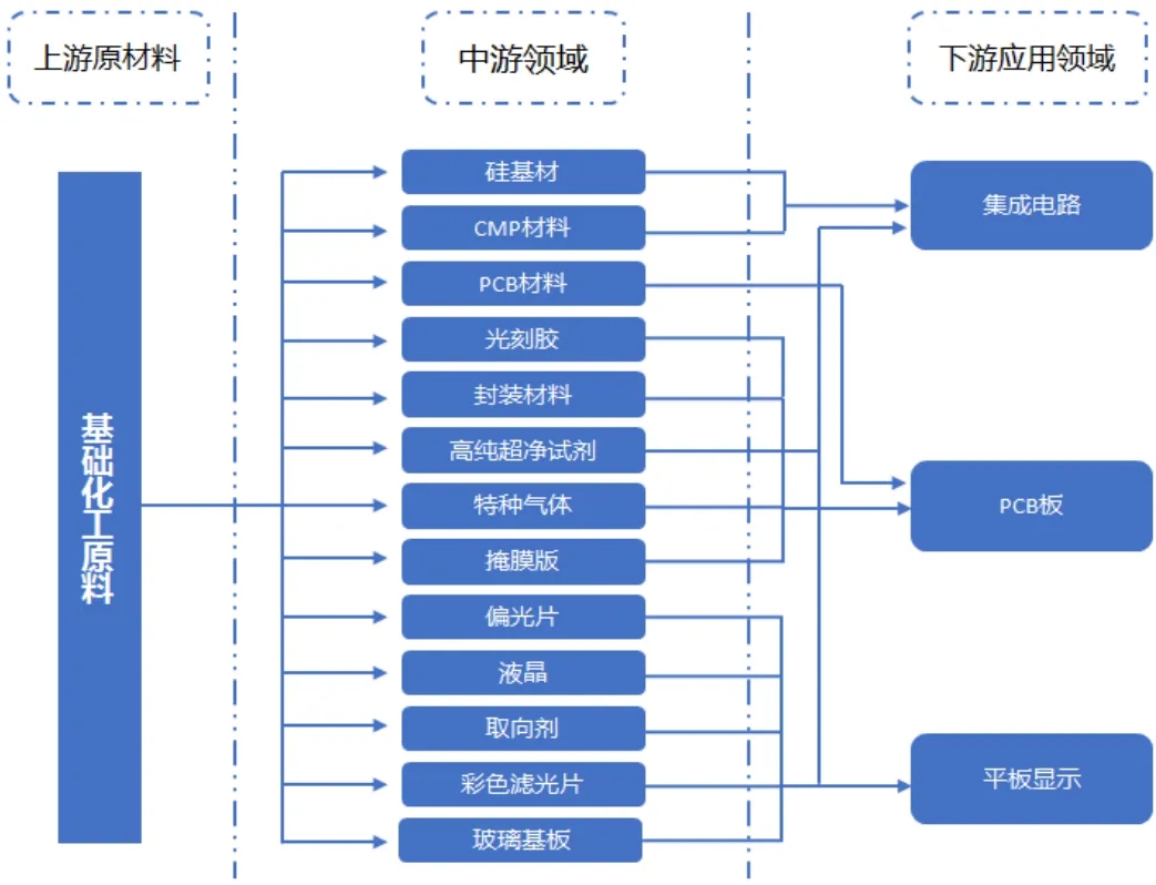 电子化学品处于“基础原料-功能材料-终端应用”的产业链核心环节。其上游为基础化工原料,包括:烷烃及其派生物、烯烃及其衍生物、醌类物质、醛类物质、醇类物质、无机酸类物质、无机碱类物质、无机盐类物质以及各式各样的工业气体等。下游应用于集成电路和分立器件、晶体硅太阳能、印制线路板、液晶显示器件、光电子器件、移动通讯设备等电子元器件,零部件和整机生产与组装,以及新能源电池等诸多领域。