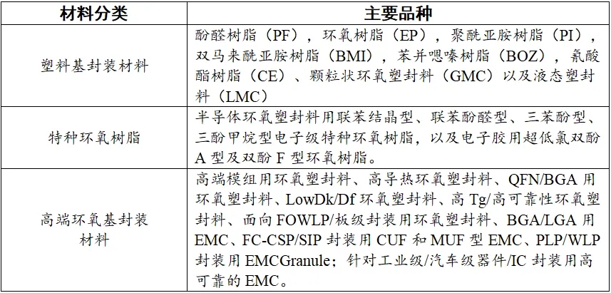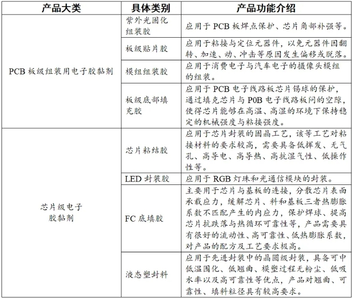 电子胶黏剂和环氧塑封料均以环氧树脂体系等材料为基础。电子级胶黏剂产品主要包括PCB板级组装用电子胶黏剂、芯片级胶黏剂,芯片级电子胶黏剂用于先进封装材料。