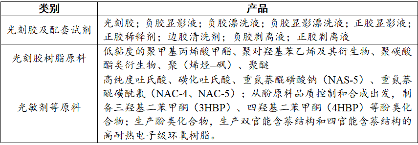 表3 重点光刻胶类别及产品
