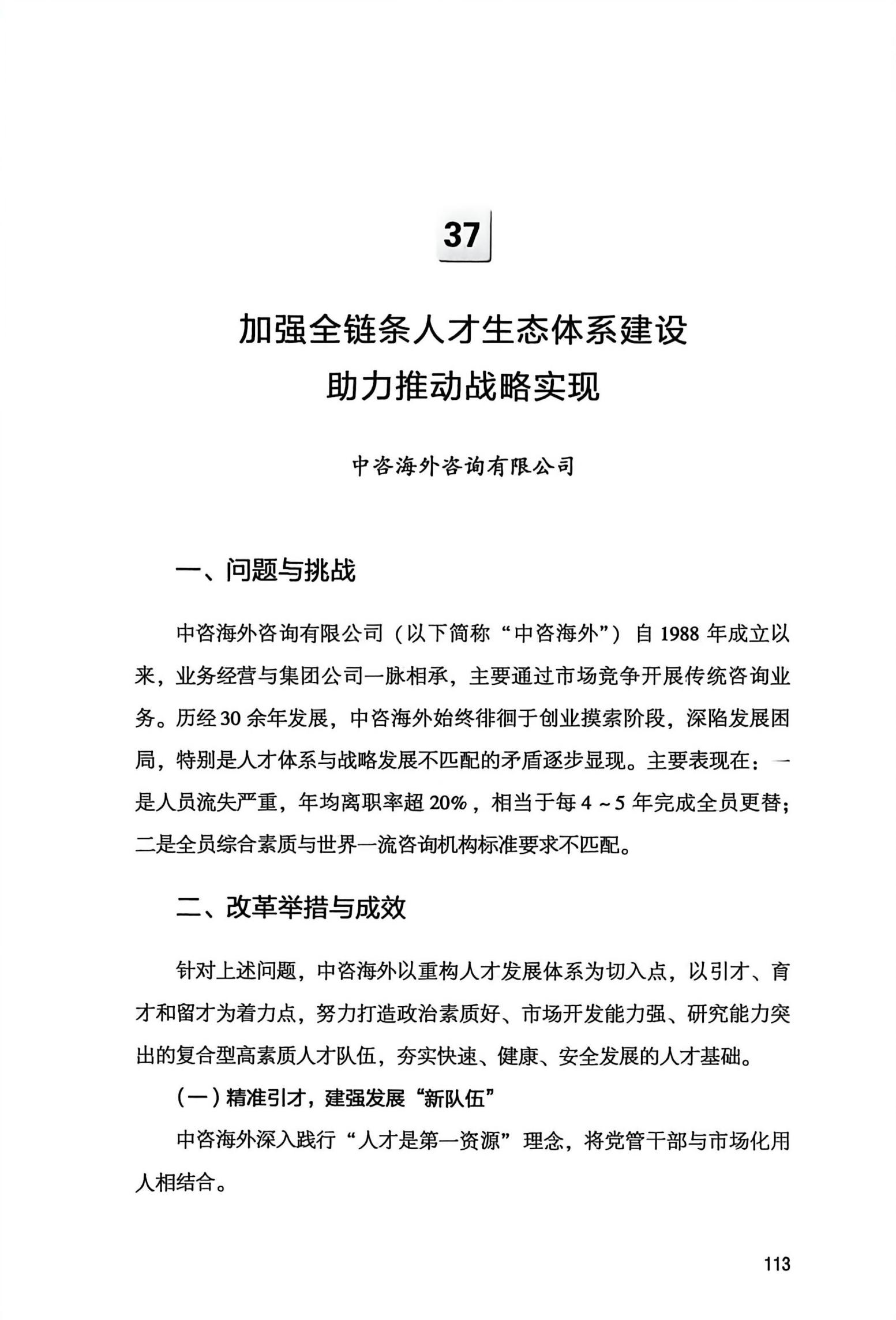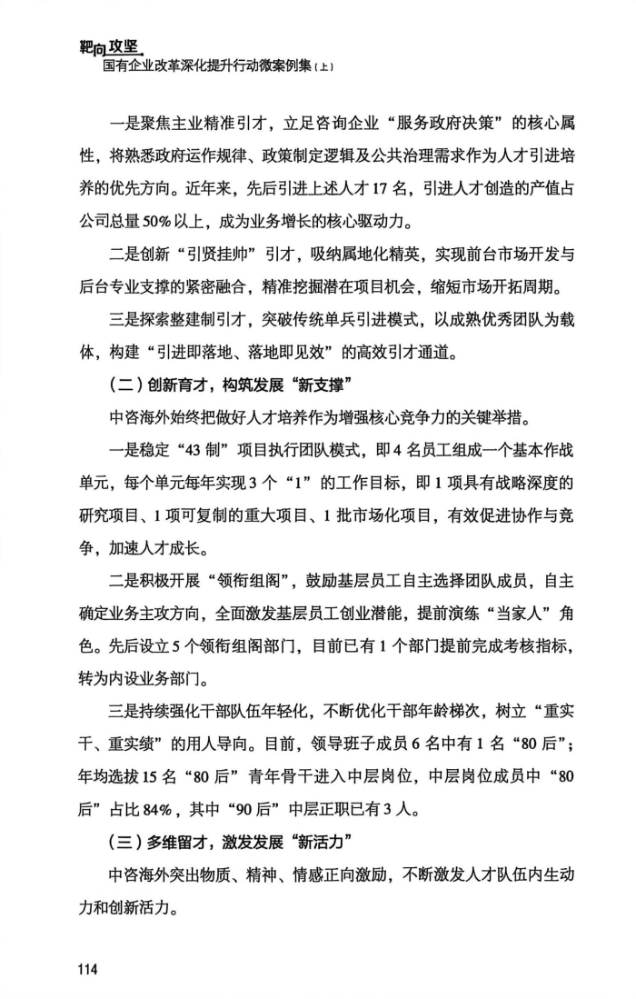近日,国务院国资委发布国资国企改革经验案例丛书——《靶向攻坚:国有企业改革深化提升行动微案例集》。中咨公司报送的所属中咨海外咨询有限公司(以下简称海外公司)实践案例《加强全链条人才生态体系建设 助力推动战略实现》成功入选。