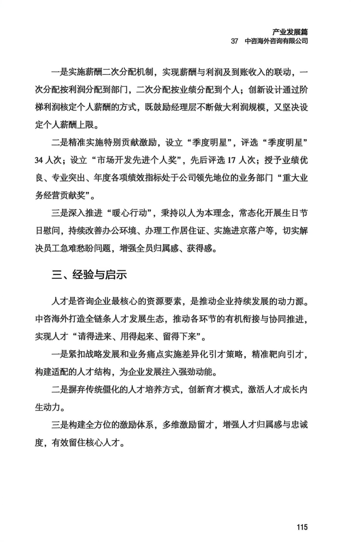 近年来,中咨公司党委坚决贯彻落实党中央、国务院关于深化国企改革的决策部署,按照国务院国资委党委工作要求,扎实推进改革深化提升行动,聚焦建设国家高端智库和世界一流咨询机构战略目标,在增强服务国家战略功能作用、完善市场化运营机制、推动业务转型发展、巩固提升咨询能力等方面取得了明显成效。特别是在推进基层改革创新方面,持续加大力度,加强政策引导、强化精准对接、深化业务赋能,充分激发基层企业改革创新的主动性积极性,加快培育具有咨询行业特色的改革尖兵。 作为第一批“双百企业”,海外公司将深化改革作为转型发展的有力抓手,持续完善内部管控机制,完善现代企业治理制度,健全市场化经营机制,形成了一批重点咨询项目和重大课题研究成果,经营质量和效益持续攀升,改革成效显著提升。海外公司以此次微案例征集工作为契机,聚焦人才队伍建设这一关键领域,以引才、育才和留才为着力点,全面梳理人才生态体系建设方面的实践经验和改革成效,形成了可复制、可推广的有效做法,得到上级单位高度评价。截至目前,海外公司已连续四年获评国企改革“双百标杆”称号。 下一步,公司将深入贯彻落实习近平总书记对中央企业工作作出的重要指示精神,按照国务院国资委党委各项部署要求,持续深化改革攻坚,深入做好规划编制、智库建设、业务发展、风险防范等重点工作,确保“十五五”开好局、起好步,努力推动公司改革发展取得更大成效。